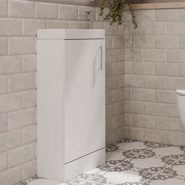 A stylish compact vanity unit, perfect for cloakrooms or en-suites, this quality floor standing cabinet in with gloss white finish comes with a chrome handle and contains 1 shelf providing practical storage.